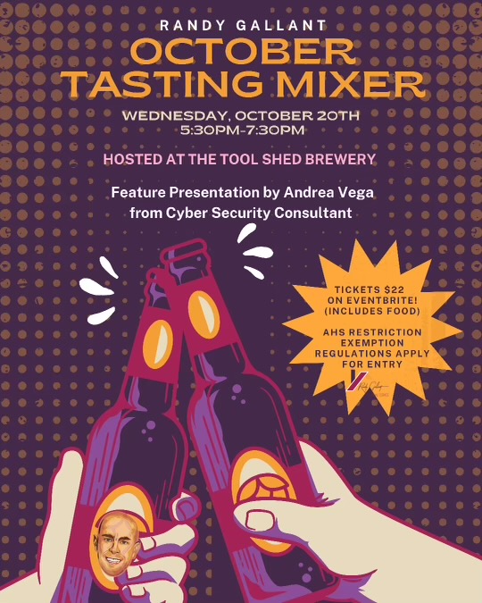 You are invited to the Randy Gallant October Tasting Business Mixer coming up on WEDNESDAY OCTOBER 20TH from 5:30pm-8:30pm. at Tool Shed Brewery: 801 30 St NE. I highly recommend their beer “Vote for Pedro”! There will be non-alcoholic drink options available. Their ribs just won first price at the “Barley & Smoke BBQ Contest”. They even have a vegetarian option: Jackfruit Tostadas. All their food is amazing!! There will be awesome door prizes to win! We had 50 people register for the September Mixer. Tool Shed Brewery is following the AHS RESTRICTION EXEMPTION REGULATIONS. The Presenter for the September Mixer will be Andrea Vega who is a Cyber Security Consultant. The topic of her presentation will be “Proactive Cybersecurity against the 91%! Purchase your ticket on Eventbrite using the link below: