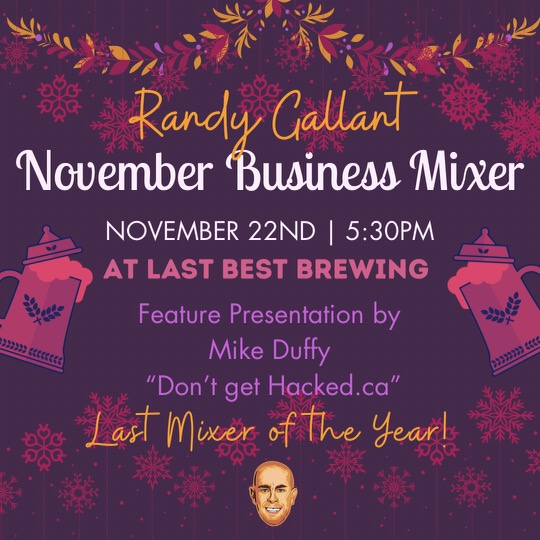 The Feature Presenter for the November Mixer is Mike Duffy with “Don’t Get Hacked.CA”. The topic of his presentation will be: “Be Authentic to Grow Your Business 10X”. He is a MSP(Managed Service Provider) with 24/7 Customer Support. They answer their phones 24/7! He provides affordable cyber security. He is Canada’s #1 Computer Support Expert! Please use the Eventbrite link below to purchase your ticket. I hope to see you there!