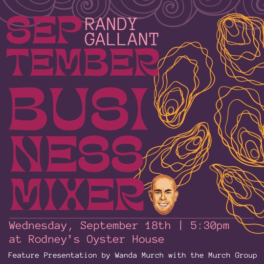 I invite you at attend the RANDY GALLANT SEPTEMBER BUSINESS MIXER: WEDNESDAY SEPTEMBER 18TH AT 5:30PM at RODNEY’S OYSTER HOUSE. We already have 56 people registered. The event is ALMOST SOLD OUT! The ticket will include an assortment of delicious appetizers including Crab Cakes, Haddock Tacos, Crispy Pork Belly and Wild Mushroom and Truffle Crostini.