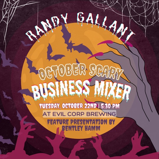 RANDY GALLANT OCTOBER SCARY BUSINESS MIXER October 9, 2024 You are invited to the RANDY GALLANT SCARY OCTOBER BUSINESS MIXER coming up on TUESDAY OCTOBER 22ND AT 5:30PM at Evil Corporation Brewing in Inglewood. Tickets now on sale on EVENTBRITE