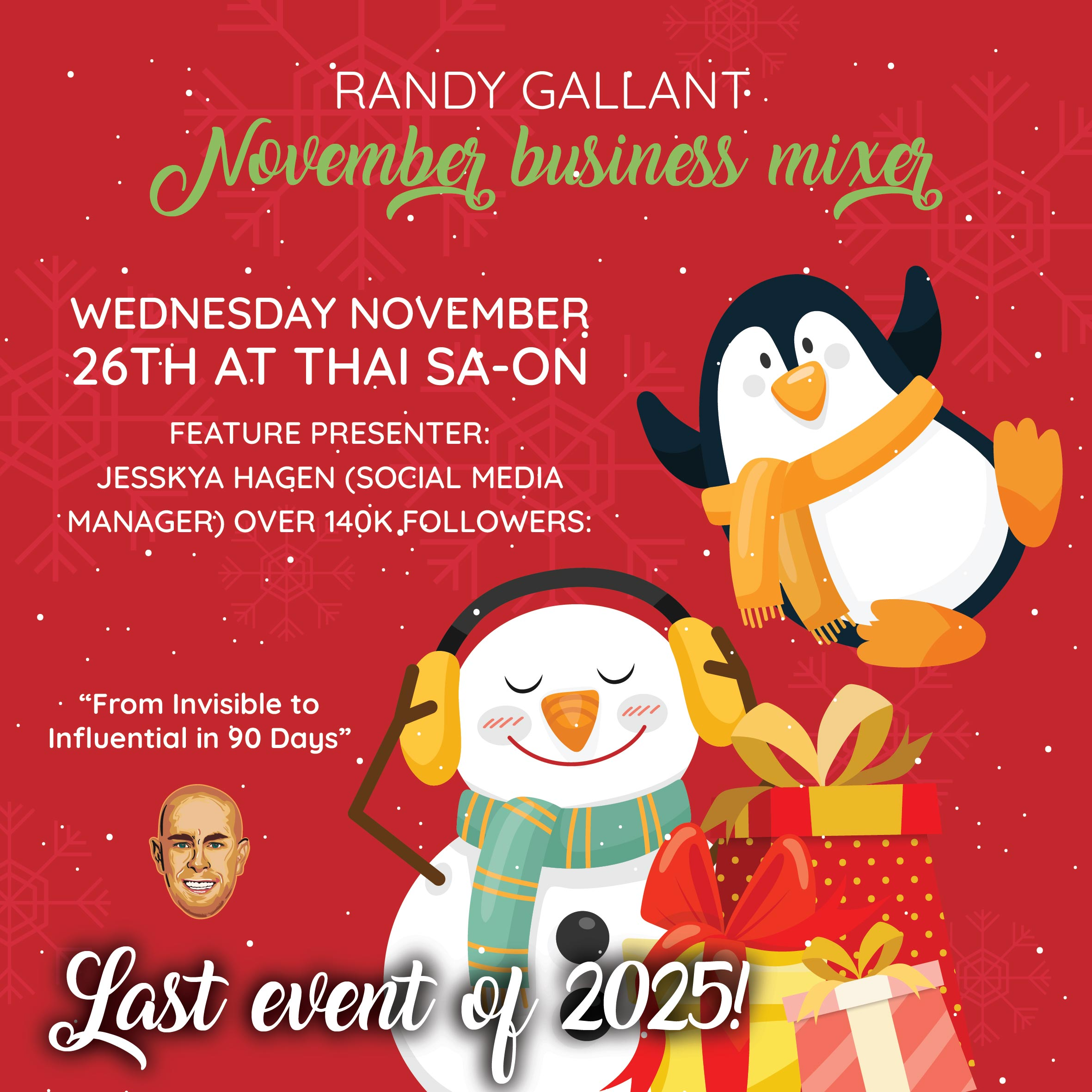 You are invited to the RANDY GALLANT NOVEMBER BUSINESS MIXER coming up on Wednesday November 26th AT 5:30PM at Thai Sa-On in the Beltline Downtown. THIS IS THE LAST EVENT OF 2025! The Feature Presenter for November is Jessyka Hagen, a Social Media Manager with over 140K Followers. The topic of her Presentation will be “From Invisible to Influential in 90 Days”. Purchase your ticket on Eventbrite using the link below: