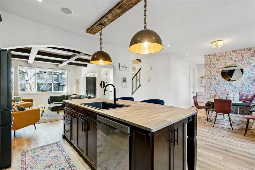 At the heart of the home is a gorgeous chef’s kitchen, complete with a large butcher block island, built-in oven, decorative hood fan, and stainless steel appliances—a dream setup for cooking and entertaining. The living room impresses with its beam ceiling and striking floor-to-ceiling rock fireplace wall, creating a warm and inviting space.